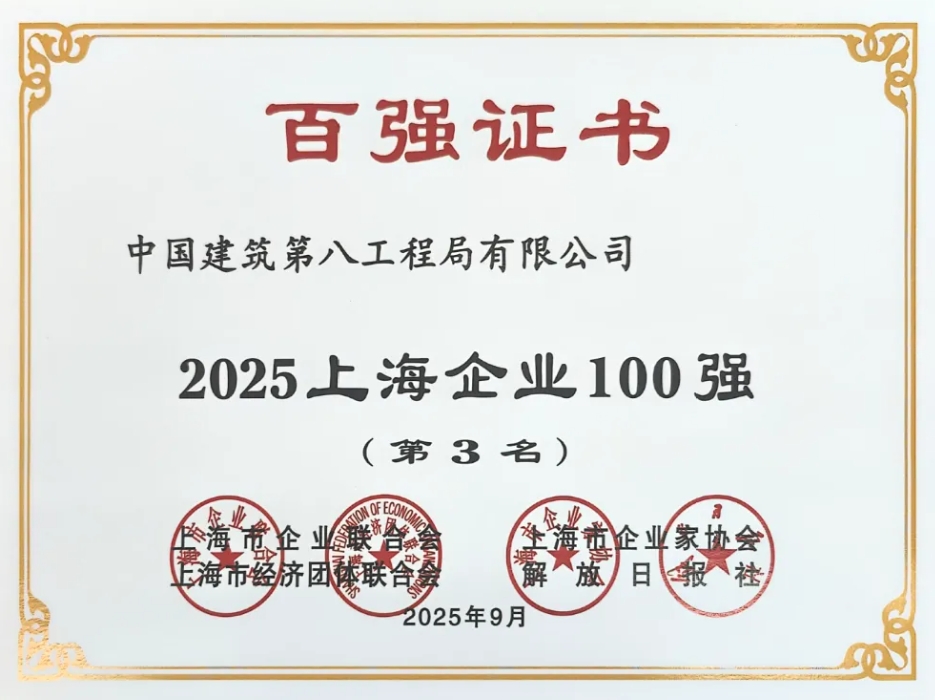 历史新高!中建八局位列2025上海企业100强榜单第3位