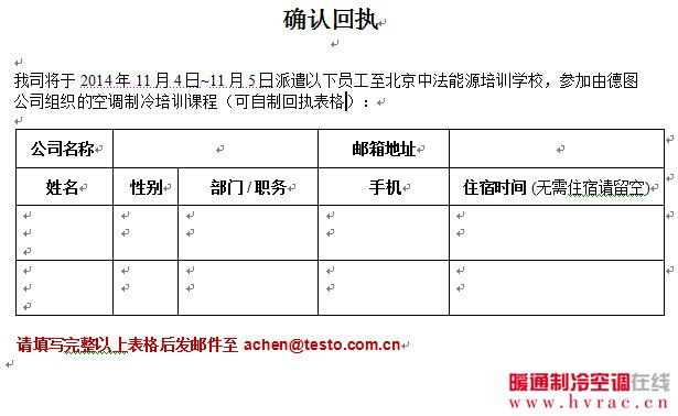 为了解参与者的详情,以便我司安排培训和住宿,烦请阁下填写回执提交,请于10月17日之前反馈至我司! 关于本次空调制冷培训检测课程的具体内容,请参见附件。