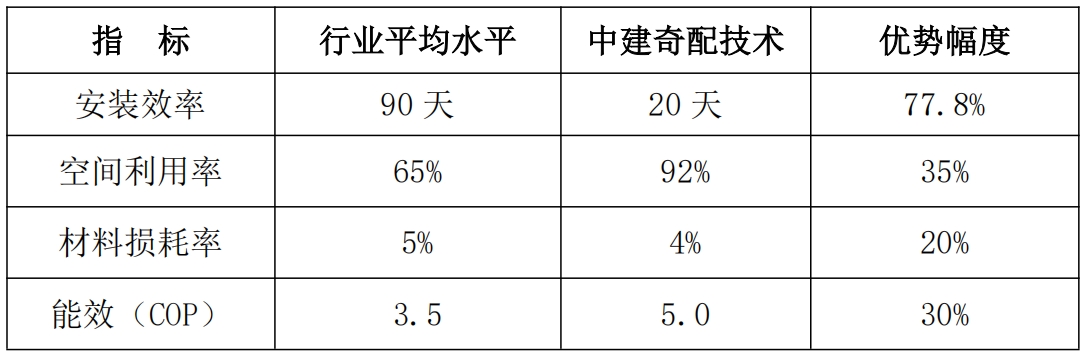 中建奇配品控负责人表示:“我们的每个模块在出厂前都经过严格测试,确保现场安装像乐高标准化拼搭一样便捷,同时保持工业级精度。”以供冷采暖面积为20万㎡建筑的制冷机房为例进行数据对比: