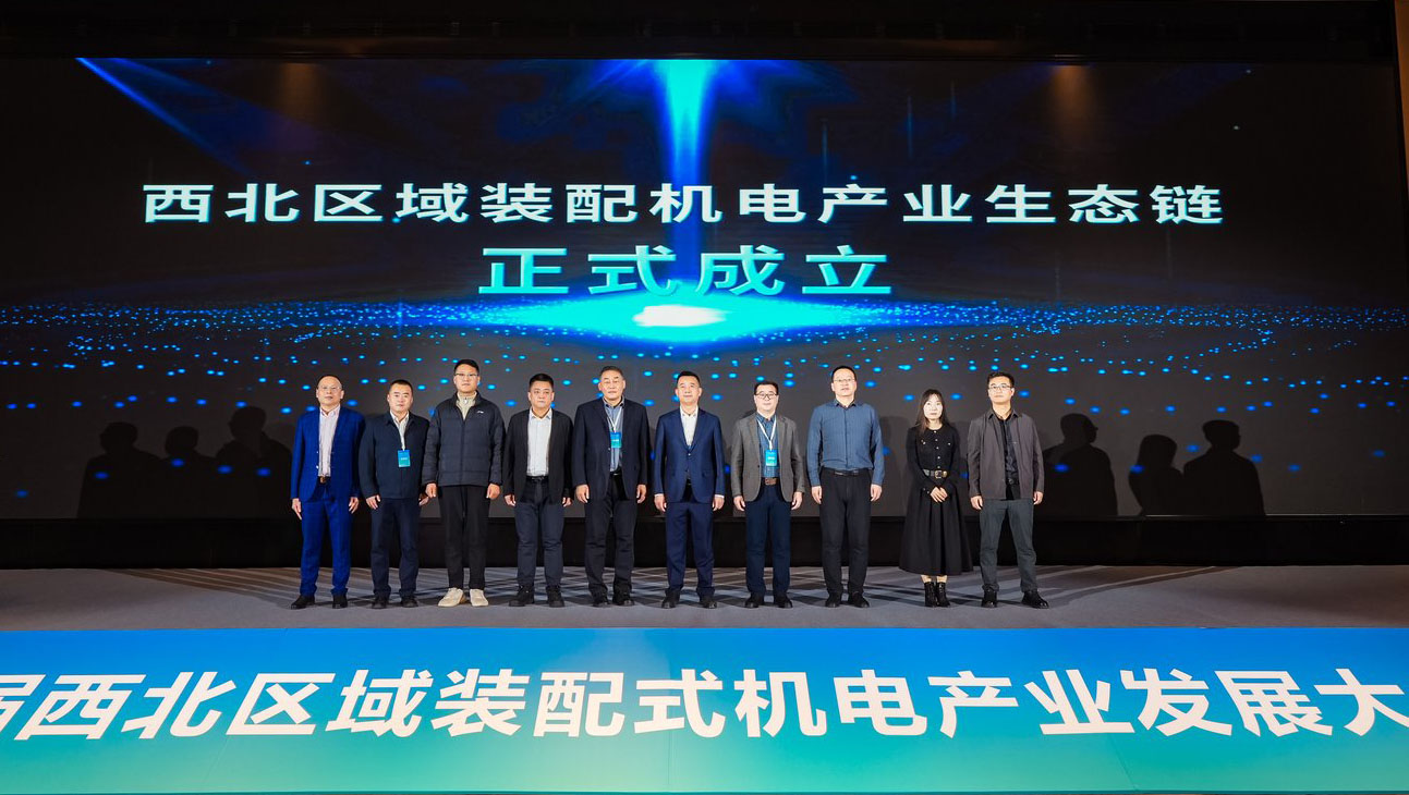 会议期间,在全体与会代表的见证下,中建三局集团有限公司西北分局副局长余自强、中国建筑西北设计研究院有限公司资深总工程师周敏、西安建筑科技大学机电学院副院长李玲、西安易筑机电工业化科技有限公司董事长邹斌、陕西建工华鑫鼎业工程装备有限公司总经理李小勇、陕建八建集团智能建造与工业化研发产业基地副总经理庞伟、陕建九建集团智能建造产业基地总经理寇润娜、西安建科软件科技有限公司总经理浮尔立、陕西盈湖建筑信息技术管理有限公司总经理张继鹏、金来邦自控阀门有限公司董事长翁远辉共同启动“西北区域装配式机电产业生态链”的正式成立,将聚焦装配式机电“产学研用”,赋能绿色建造的行业前沿,共筑西北产业协同新高地。