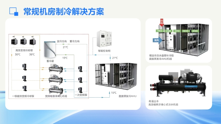 水系统方案主要利用高温水系统+高效末端、Freecooling风冷螺杆/风冷磁悬浮+高效末端组合,建筑适应性较好,可满足长距离输送;风系统方案采用间接蒸发冷却AHU或直接蒸发冷却AHU,能因地制宜,更好地满足数据中心高速发展、快速建设的需求;氟系统使用的气氟一体技术,适用于中小机房及节能改造,产品方案灵活,建设周期短。风液兼容作为一种创新的冷却架构,风液比可根据业务发展灵活调配,系统2N模块化设计,实现了能效、成本、空间利用与可靠性的最优平衡,正逐渐成为智算中心的主流选择。