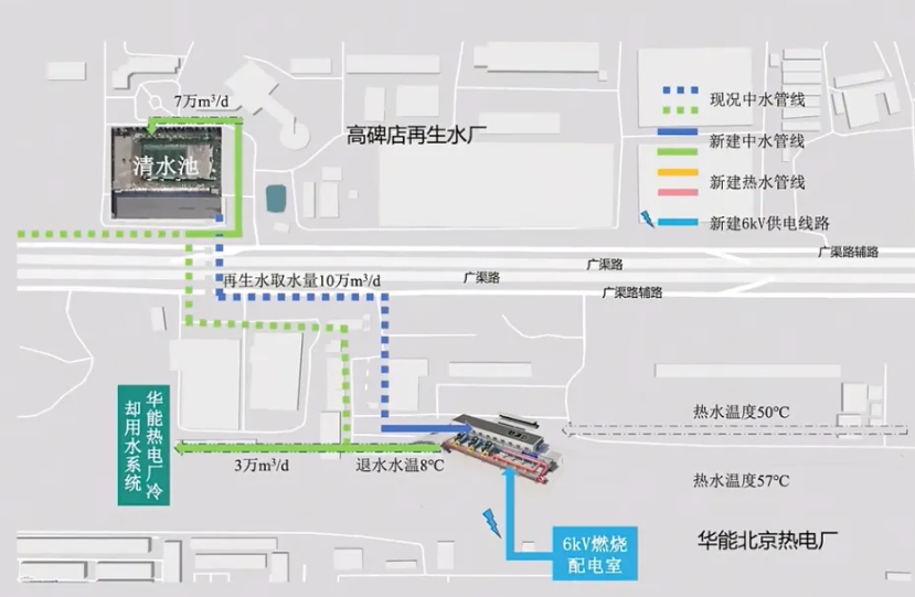 该项目由国企和央企协同推进,打通了水务、热力与能源三大系统。通过创新性地将北排高碑店再生水厂排放的再生水作为热源,并利用高效热泵技术提取余热,直接将其补入北京市政供热管网,为城市清洁供暖探索出了一条可复制、可推广的新路径。