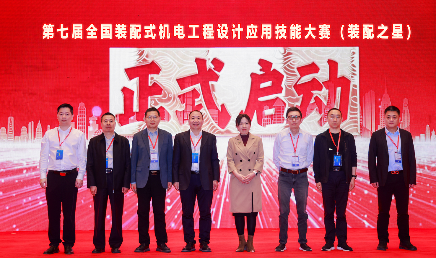 第七届全国装配式机电工程设计应用技能大赛(装配之星)启动嘉宾(从左至右):湖南中建奇配科技有限公司总经理黄水龙,深圳市建筑设计研究总院有限公司暖通顾问总工吴延奎,山东省建筑设计研究院有限公司总工程师、山东省工程勘察设计大师李向东,中国中建设计研究院有限公司总工程师满孝新,中建八局第二建设有限公司党委副书记、工会主席张慧,华东建筑设计研究院有限公司机电一院机电总师左鑫,四川建筑职业技术大学教授毛辉,中国设备管理协会装配式机电专业委员会副主任委员兼秘书长邹斌