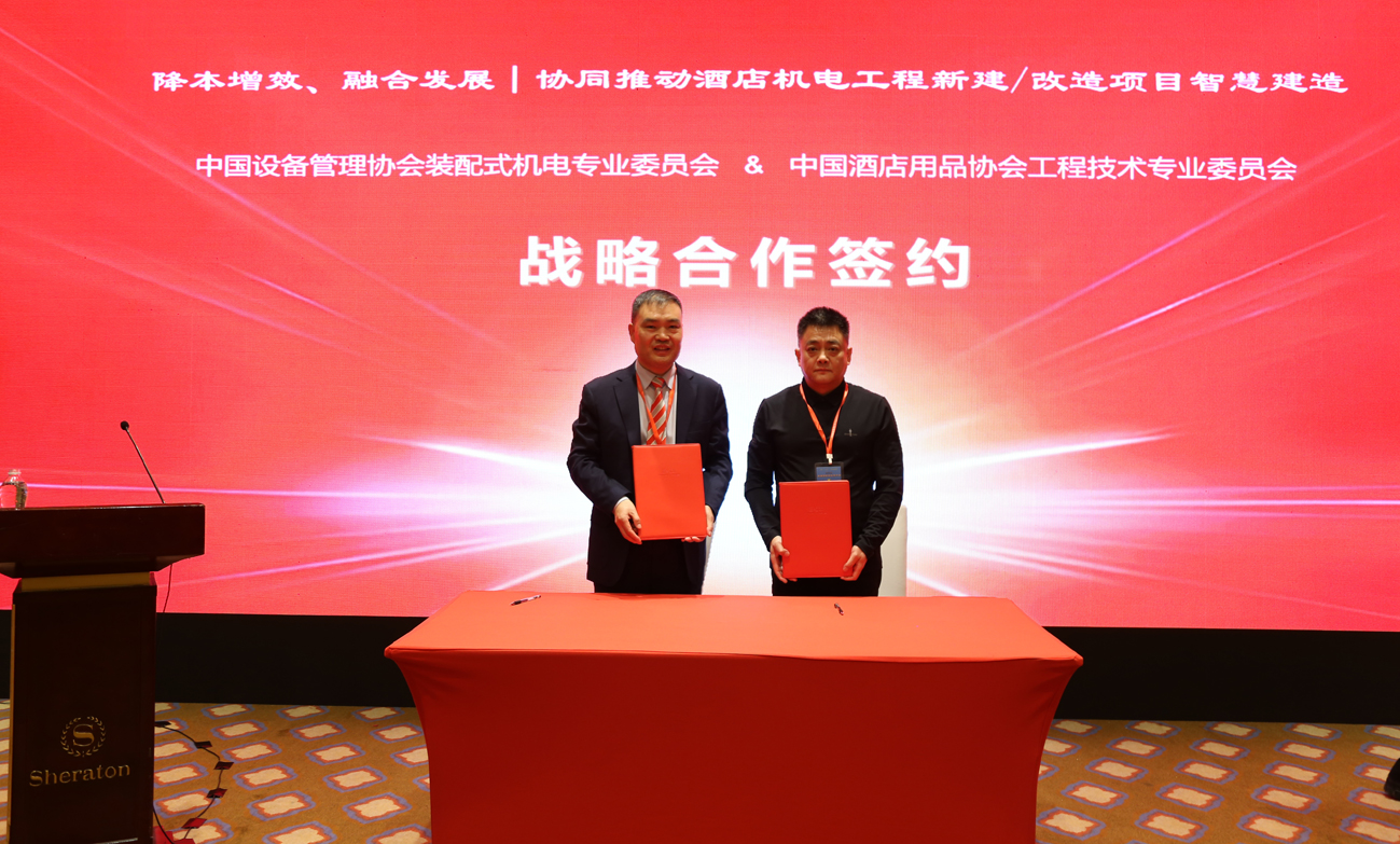 为推进酒店业机电工程(新建/改造)智能建造和新型工业化进程,实现装配式机电技术应用和酒店机电工程的降本增效、融合发展,在与会代表们的见证下,中国设备管理协会装配式机电专业委员会副主任委员兼秘书长邹斌、中国酒店用品协会工程技术专委会常务副会长兼秘书长艾红强分别代表双方签署了战略合作协议。双方将通过自身技术和资源优势,围绕酒店机电工程智能建造、节能改造、运行维护等专项技术、以及专项活动组织联合开展全方位合作,为推动行业高质量发展做出积极地贡献!