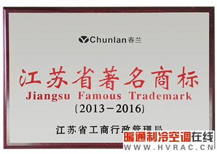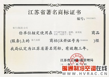 根据《江苏省著名商标认定和保护办法》之规定,日前,江苏省工商行政管理局对届满三年的江苏省著名商标和新申请认定的商标进行了认定,经公示、调查论证,并征询有关地区、部门、行业组织和社会团体的意见,“春兰”商标再度被认定为“江苏省著名商标”。
