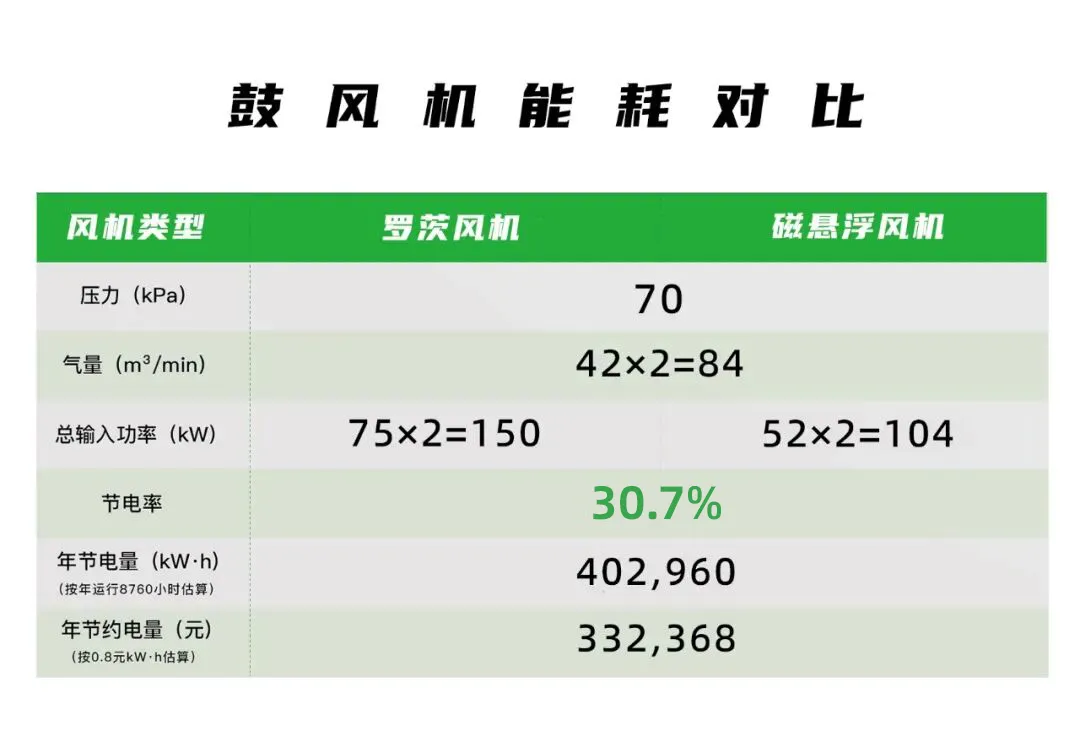 为解决上述问题,该企业启动曝气系统升级项目,通过对不同品牌、类型鼓风机的技术参数、节能效果、用户案例及售后服务进行全面调研对比,最终选定2台磁谷科技臻品系列磁悬浮鼓风机替换原有罗茨风机。改造过程中,技术团队严格把控设备匹配性,确保磁悬浮鼓风机的总风量、出口压力与原有管路系统完全适配,无需对好氧池及配套设施进行改造,实现了 “无缝衔接”。设备投运后,运行数据显示和原设备保持同样工况的条件下,设备运行功率从原本的 75kW 降至 52kW,节电率超30%,年节电约33万元,同时设备运行稳定性与处理效果均得到显著提升。