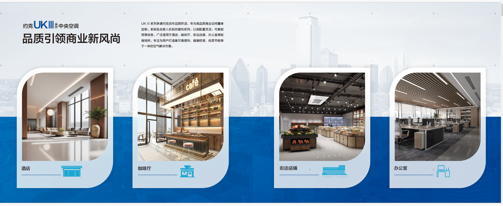 此次会议中,UK III系列作为主推产品备受关注。该系列承载约克百年品质积淀,专为高品质商业空间量身定制,包含嵌入机和风管机系列。其具备配置灵活、可靠耐用、高效节能等核心优势,广泛适用于酒店、咖啡厅、街边店铺、办公室等轻商场所,不仅能提供可靠的温度调控支持,更能助力用户实现绿色低碳运营,是打造标杆解决方案的有力支撑。