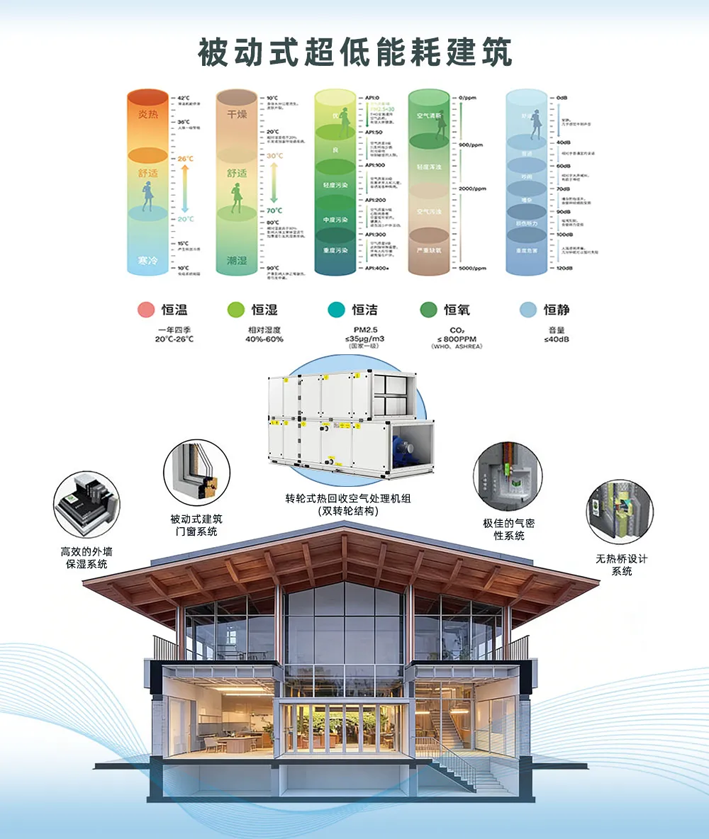 提升室内空气品质与舒适度往往伴随能耗增加,而作为超低能耗项目,嘉定未来城市对新风系统的热回收效率提出了严苛要求。项目采用环都拓普转轮式空气处理机组,核心部件转轮式热交换器搭载先进的分子筛涂层技术,保障了高效换热能力;为进一步提升热回收效率以匹配超低能耗建筑标准,机组采用双转轮结构,通过两级能量交换的叠加效应,最大程度回收排风能量,大幅降低系统整体能耗。同时,可适配更小规格的冷热源机组,不仅减少了设备投入与占用空间,更为项目实现全生命周期低碳运营提供了关键支撑。