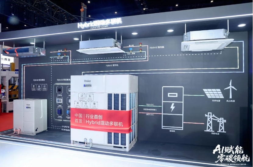 以用户需求为中心,体验升级永不止步。海尔敏锐捕捉到商用场景中用户操作、舒适、安装等全流程痛点,加速新品迭代,在 AI 多联机智慧能力之上,推出行业首创Hybrid混动多联机,采用水氟混动技术,实现氟不入户,从源头规避冷媒泄漏风险,带来柔和静音体验;依托交直流混动架构,可接入光伏等多元能源,支持0电费运行,有效降低用电成本;联动智能通讯实现智慧运维,降本增效。同时,通过技术创新完成R410A向R32冷媒迭代,兼顾高能效与环保属性,深度契合双碳战略与新冷媒替代趋势。