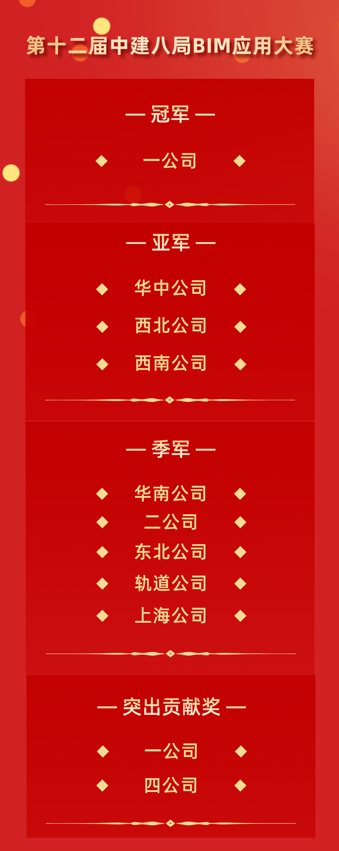 经过严格评审,大赛最终评选出冠军1名、亚军3名、季军5名及突出贡献奖2项。其中,一公司荣获冠军,华中公司、西北公司、西南公司获得亚军,华南公司、二公司、东北公司、轨道公司、上海公司获得季军,一公司、四公司获突出贡献奖。